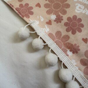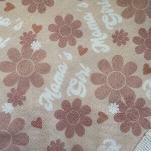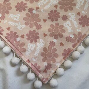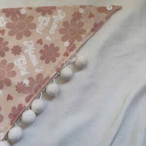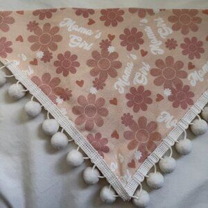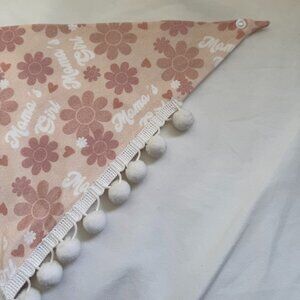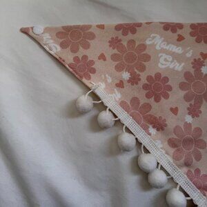 This cute dog bandana features "Mama's Girl" in a white 70s font and has a soft pink and darker pink spring daisy floral pattern with hearts. It is detailed with a white pom-pom lining! Please note that the pom-poms have some lint. It is the perfect accessory for your pet, and it has an easy button closure. It is a size medium.