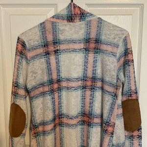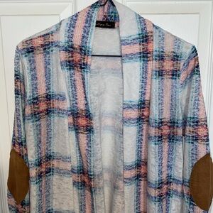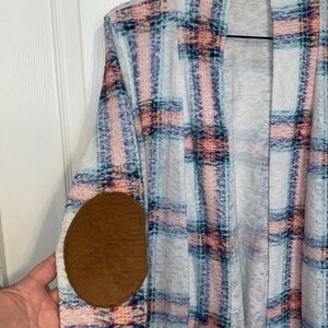 EUC Lollipop Star Cardigan, size Large. Cardigan has brown oval patches on the elbows. Colors are various shades of pinks, blues and small hints of yellow. Primary color is white. Fabric is 87% polyester, 8% rayon, and 5% spandex. Fabric is very light and slightly see through.