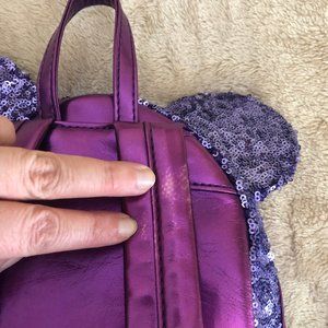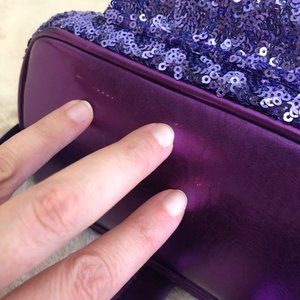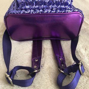 This sold out, special edition mini backpack has sparkly purple sequins & silver tone zipper pulls. Faux leather back panel & adjustable carry straps. Cute purple & white polka dot fabric interior lining. Two side pockets for holding a cell phone or mask. A beautiful bridal, wedding, anniversary or birthday present for a fellow collector.