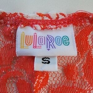 LulaRoe Coral Lace Cardigan. Open front.100% polyester. Measureas flat 25" underarm seam to seam. Sleeve measures 19". Length measures 33" in back. Size Small EUC