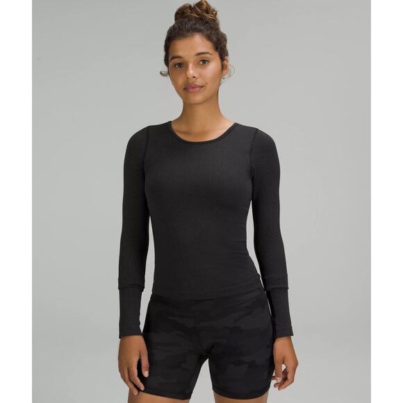 Classic Lululemon Ebb To Street long sleeve top in black, designed in a soft ribbed seamless knit. Features a flattering scoop neckline, long sleeves, and a built-in shelf bra with removable cups for light support. Comfortable, stretchy fabric makes this an easy piece for yoga, low-impact workouts, or everyday layering.