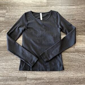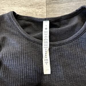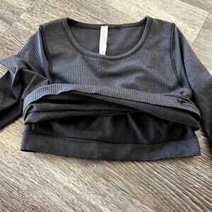 Lululemon ebb to street top, black ribbed long sleeve, built-in bra top, seamless activewear, yoga long sleeve shirt, lululemon layering top, athleisure essential, lululemon size 6