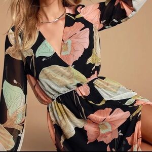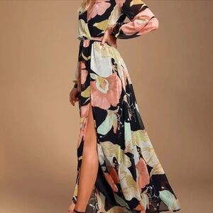 EUC Lulus Wondrous Water Lilies Black Floral Print High Slit Maxi Dress