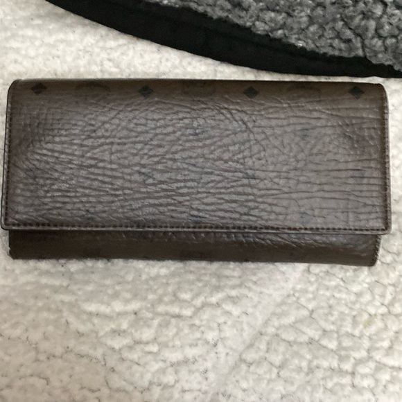 Beautiful MCM wallet. There is a total of 10 card slots, one inside zipper, three pockets, an inside snap then an additional snap to close. No call outs.