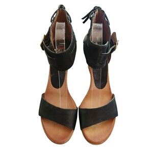 EUC MIZ MOOZ KIANI BLACK LEATHER STRAPPY BUCKLE WEDGE SANDAL SZ 40