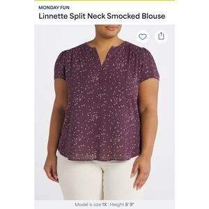 EUC MONDAY FUN Linnette Split Neck Smocked Blouse | 1X | Purple/burgundy