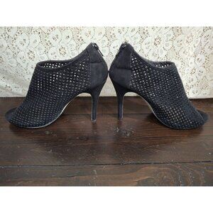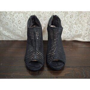 Elegant and versatile Madden Girl black peep-toe heels with a perforated design for breathability and style. Features a back zipper for secure wear and ease.