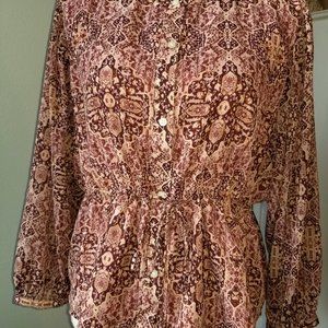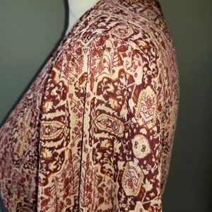 A beautiful pattern with a bohemian vibe! Lined in a mauve color, this has shades of burgundy, mauve and cream. the measurements is with drawstring let out. Its in EUC with no tears, snags or pilling. It is simply too big for me. Measurements are approximate.