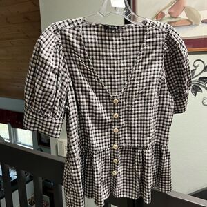 Stylish black and white checkered blouse with puff sleeves and button-down front. Perfect for casual outings. Length 22”, pit to pit 19”. From a smoke free home 🏠