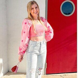 EUC - Main Strip Heartfelt Milkmaid Smocked Sequin Hearts Crop Top - Size: Large
