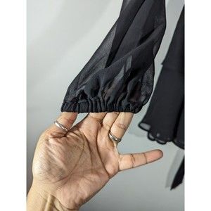 No holes, stains, or tears. 100% Polyester. Lined Sheer sleeves. Plunge V Neck