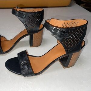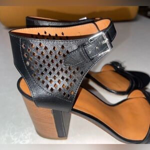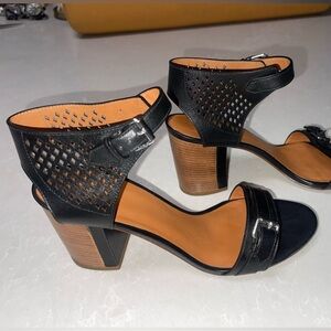 These stylish heels feature a black perforated leather upper with a geometric diamond pattern, offering both elegance and breathability. The chunky stacked wooden block heel adds a modern touch, while the ankle strap with buckle closure ensures a secure fit.