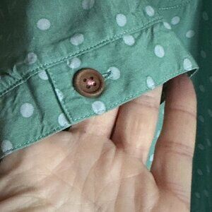 * Mint green with polka dots, beautiful ivory eyelet and wooden buttons.