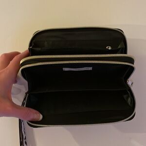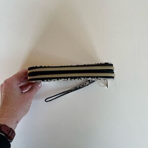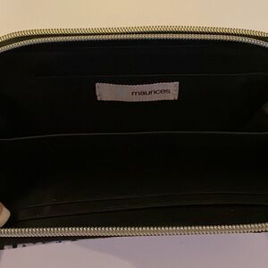 EUC Maurices Pink and Black Leopard Print Double Zipper Clutch with Removable Wristlet. It measures 8 inches across and 4 inches in height.