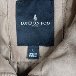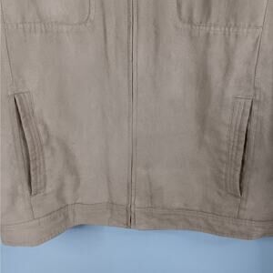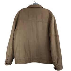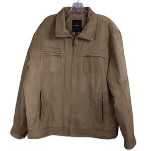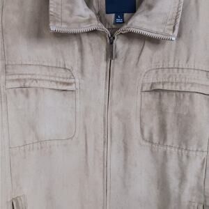 This is a very nice men's jacket and in excellent used condition. It has a microfiber feel to it and the shell, lining, and insulation are made of 100% polyester. It measures 25 inches from armpit to armpit lying flat and 28 inches from the nape of the neck to the hem. It has a quilted lining, collar, two inside pockets, two pockets at the hip, and two chest pockets with zippers. It zips closed and the zipper is in working order.