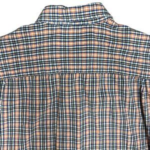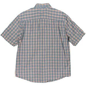 * STYLE- Short sleeve, cotton, collared, soft, button-down shirt made in India. Pointed collar. High sides for flexibility, comfort and ability to tuck or leave untucked. One, open-top, front chest pocket with metal logo tag. Two, back, pleats. Extra button attached. There is a nice texture to this shirt. Some of the orange striping in this plaid pattern is embroidered (see close-up photo).