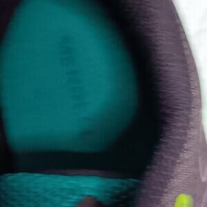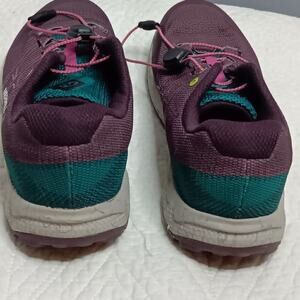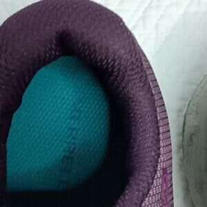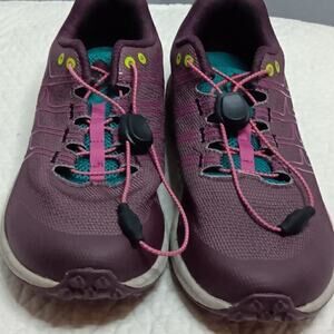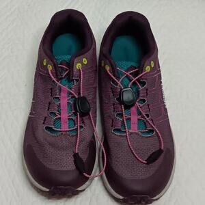 These Merrell dark purple and teal shoes are in excellent condition. The sole looks like they have never been worn. They show minimal to no wear. They have elastic cording closure. The soles have good traction for hiking and rough terrain walking. They are size 6.