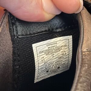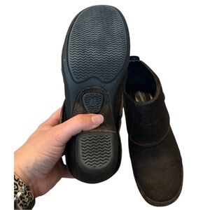 This is a pair of size 9.5 Merrell boots. They are espresso colored suede with staples around the toe box, decorative button detail, memory foam footbed, and Merrell air cushion in the heel.