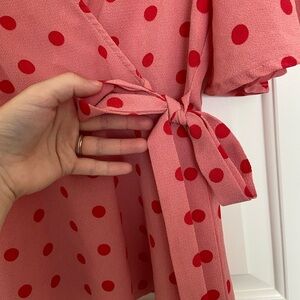 Women’s Mi Ami blouse. Top is pink with red polka dotted pattern & overlay design with a tied waist. Sleeves are a bit flowy in design. Size medium. Smoke free home!