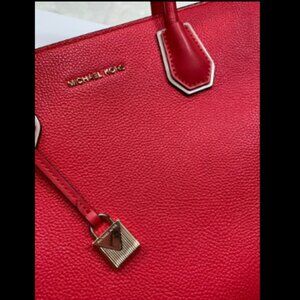 This EUC Michael Kors Mercer Women's Tote Bag in hot pink is a luxurious and stylish accessory for women. This large tote features gold hardware and a floral lining, adding a touch of elegance to the pebbled leather exterior. With a zip closure and hot pink leather handles, this designer bag exudes a chic and sophisticated charm. Perfect for everyday use or special occasions, this Michael Kors tote is a must-have for anyone looking to elevate their fashion statement.