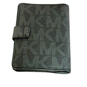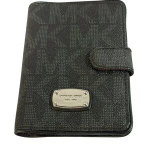 The EUC Michael Kors Passport Case/Holder is a stylish and practical travel accessory for organized individuals on the go. This wallet/organizer features a clear window for easy viewing of your important documents, while the sleek black design with grey MK accents adds a touch of sophistication. Keep your passport, cards, and cash secure and easily accessible with this high-quality and fashionable accessory from Michael Kors.