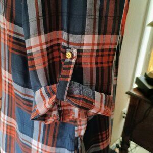 Excellent Used Condition: Miss Lili Sze 2X Blue Plaid Zip-Front Top. The classic plaid pattern features a mix of navy blue, red, and white, making it a versatile piece for any season. The top has a gold-tone zipper closure down the front and decorative zipper details on the chest. It is designed with 3/4 length sleeves that can be rolled up and secured with tabs. The comfortable fabric blend makes this a great layering piece or a standout item on its own.
