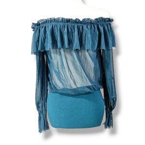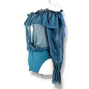 EUC Missguided Off the Shoulder Ruffle Sheer Blouson Bodysuit Sz. 6 Teal