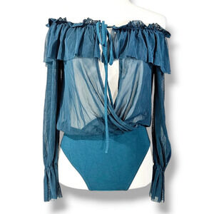 EUC Missguided Off the Shoulder Ruffle Sheer Bodysuit Sz. 6 Teal