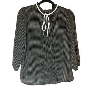 EUC Monteau Black and White Polka Dot Blouse Size XL. Cute bow tie at the top. Ruffles down the middle.