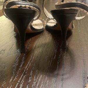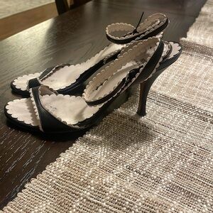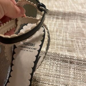 EUC Moschino cheap and chic black with white trim Strappy sandals are my favorites! Only selling because they don’t fit after babies. 😣. Wrap around ankle, 4 inch heel (but very comfortable), can be dressed up or down. No stains or odor. Smoke free home. Minimal wear on heel.