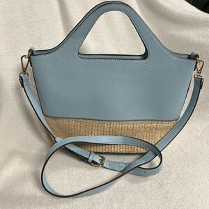 PRETTY LITTLE PURSE! EXTERIOR IS A SOFT BLUE WITH LITTLE TINY GOLD BEADING AROUND TOP OF WHERE THE TREATED WICKER BOTTOM STARTS. GOLD HARDWARE. ATTACHABLE SHOULDER STRAP. INTERIOR IS BEIGE AND WHITE CHECKERED WITH 1 ZIP POCKET
