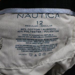 Black dress pants from Nautica. Size 12 Regular. Zipper and hook closures. Four pockets: one on each hip, two in seat. Adjustable waistband. Wrinkles due to storage. Smoke/pet/allergen-free