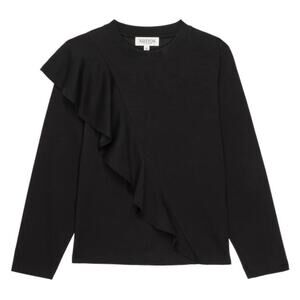 SOLD OUT online -- Nation Los Angeles Farrah top in classic black. Features an asymmetric cascading ruffle across the front and back, crew neckline, and soft Peruvian cotton blend. A polished statement tee that adds sculptural detail to any outfit. Worn once and beautifully maintained.