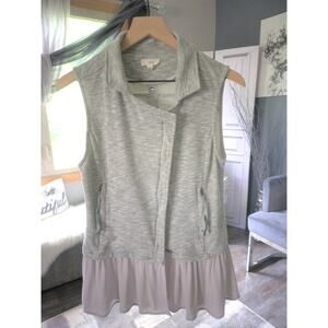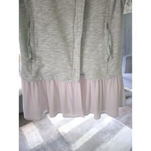Sweatshirt material. Pleated layer at hem. Side pockets with zip closure. Full zip in front. Mid-weight. Cotton/Polyester blend. Unique top!!