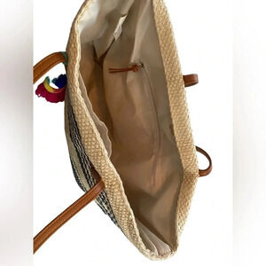 EUC Old Navy Basket Striped Tote Bag Colorful Tassel - Great for the Beach - Inside zip pocket - Brown Faux Leather Handle Straps