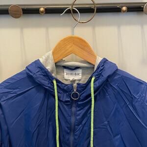 This Olive + Oak lightweight hooded jacket is a perfect blend of casual style and practical functionality. With its bold blue color, contrasting neon green drawstrings, and soft grey lining, this jacket is both stylish and comfortable. Ideal for layering on cool days or as an everyday casual outerwear piece.