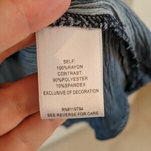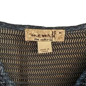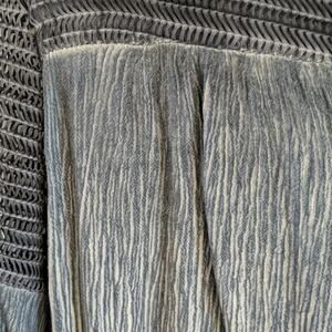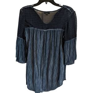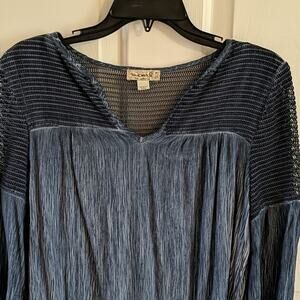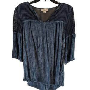 Gauzy blue top with contrasting dark blue mesh at top by one world