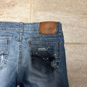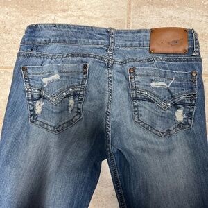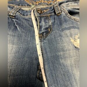 ๐PAPAYA DISTRESSED BOOT CUT JEANS WITH RHINESTONES ON BACK POCKET AND BUTTON IN FRONT. THESE JEANS ARE IN EXCELLENT CONDITION WITH THE EXCEPTION OF THE PATCH ON THE BACK RIGHT SIDE. Its missing the embellishment on it as shown in picture ๐๐