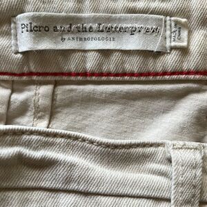 PILCRO and the Letterpress by Anthropologie buttonfly hi-waist shorts in excellent preloved condition. Size 29. Cute sewn pleats on short front. 98% cotton and 2% spandex. Inside short pocket has light pink stain — see last photo. Color is cream.