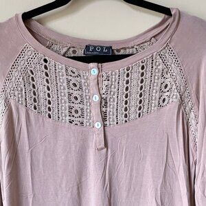 EUC POL Distressed Long Sleeve Henley With Crochet Detail, Light Mauve, Small