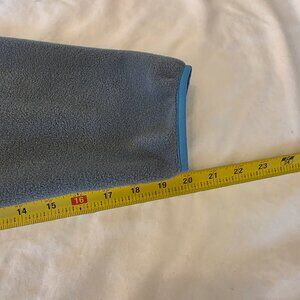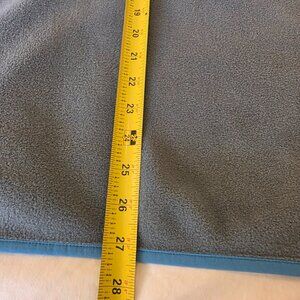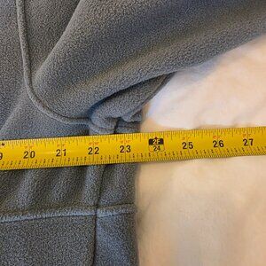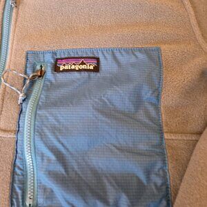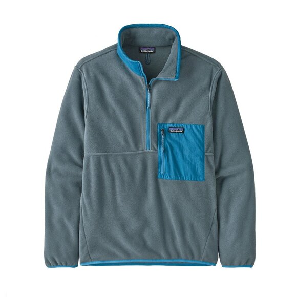 Outstanding condition men's Patagonia half-zip fleece pullover with zip-through stand-up collar for warmth; exterior of collar is trimmed with recycled nylon from the Houdini family for added wind protection. Set-in sleeves provide chafe-free comfort and a wide range of motion; cleanly finished cuffs and hem feel smooth and soft on the skin. Left-chest patch pocket has a zippered closure for security. Skin-friendly elasticized spandex binding reinforces bottom hem and sleeve cuffs for all-day comfort. Plume grey with blue trim, see photos for measurements. Ships from a smoke-free, doodle-infested home.