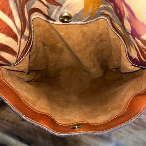 EUC Patricia Nash Luzille Convertible Painted Leather Handbag/Crossbody/Backpack. Pocket on the back. Large compartment on top of bag with zipper and slip pockets. 2 pockets under the flap. Strap adjust to carry 3 different ways.