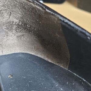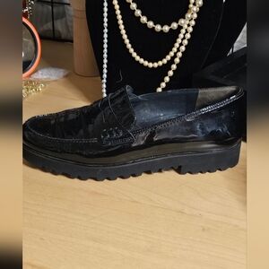 Black patent leather penny loafers with a lightweight lug sole by Vibrant, who make very comfortable sneakers, so these are definitely an all day wear with no discomfort.