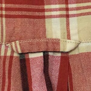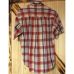Pendleton plaid sunset colors orange, cream, tan, rust, black tropical weight Buttondown. Short sleeves, left breast pocket. 100% cool comfy cotton. Previously owned in beautiful shape no flaws stains or odors