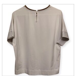 Chic short sleeve top with white body and brown neckline. Ideal for casual elegance.