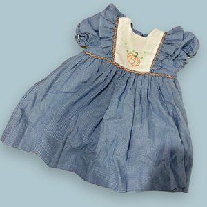 Super sweet Harvest/ Fall dress for Thanksgiving or pictures! The dress is Petit Ami and wonderfully made. Beautiful blue check pattern and gorgeous chest plate with embroidered pumpkin and details. Pretty ruffle at the chest/ arms and puff sleeves! Could not be cuter! Note a "matching" little brother set is also posted!