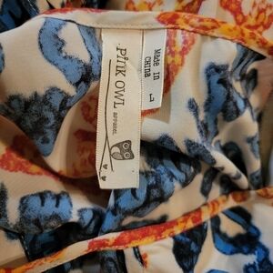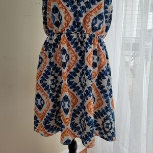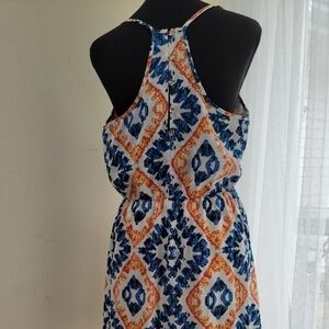 EUC Pink Owl racerback dress. Fun blue and orange print. Cute back button details. Measures flat 18.5" underarm seam to seam. Elastic waist measures 14.5" flat unstretched. Lined skirt is 19" from waist to hem. Pair with a jean jacket to wear more seasons! Size L.
