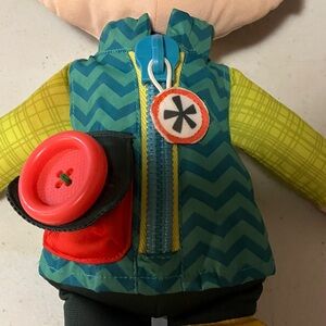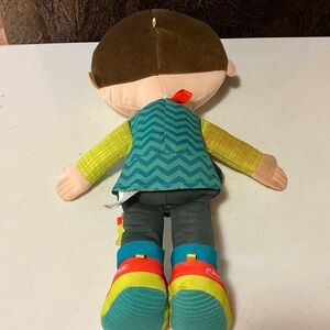 This adorable interactive learning doll is perfect for kids. Dressed in a vibrant blue and green outfit, it encourages fun and educational play. Ideal for developing fine motor skills.