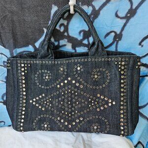 EUC Prada Dark Blue Denim Canapa 2 way Tote bag, with crystals and silver grommets. Notice crystals and grommets are on all 4 sides of the tote. This tote has 2 inside zippered pockets and 3 inside slip pockets, 2 inside D rings, and 4 feet on the bottom. Zippers are zippy, and no rips tears or stains. One side has a small white spot, please see pictures. Some tarnishing on each of the 4 Prada branded feet. Side snaps make this bag extendable. Strap is not included. Prada Dustie is included. Please see all pictures. This tote is fabulous.