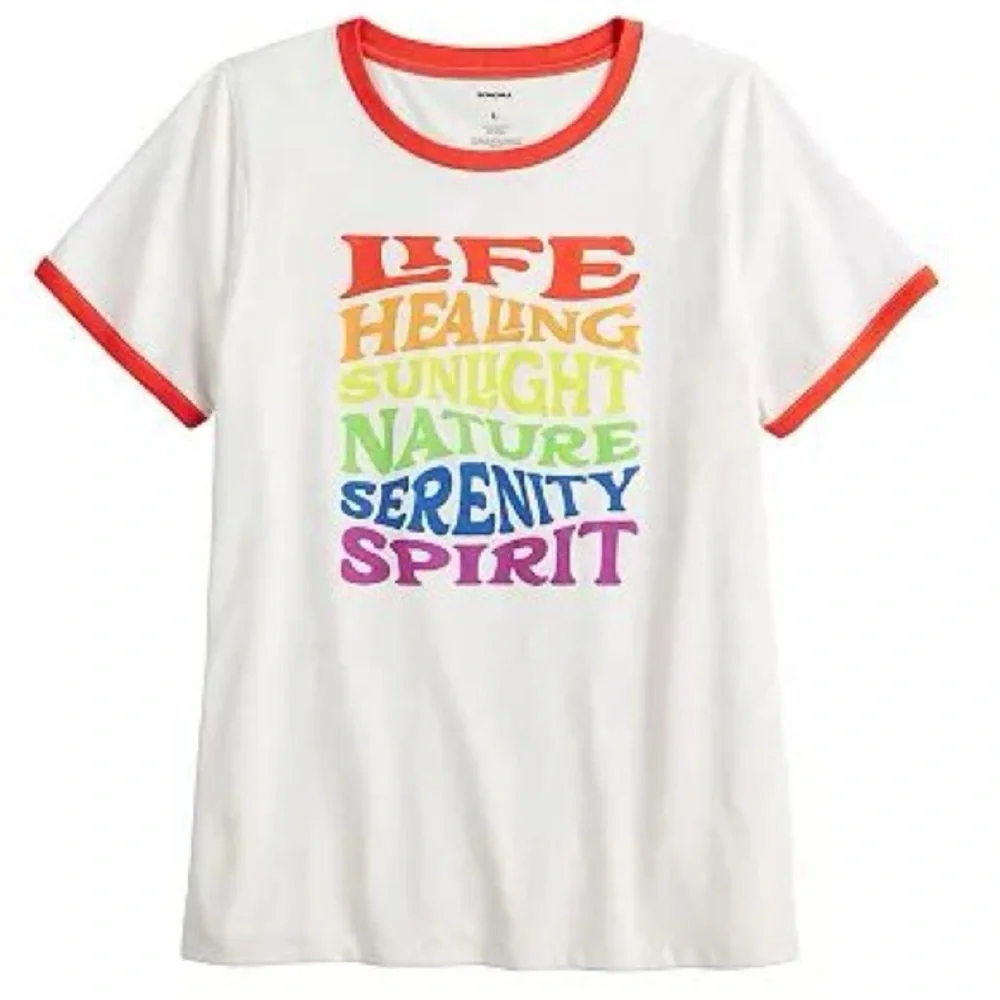 Vintage look and feel of a ringer tee with a Pride theme. Each color is repped by its' own meaning from one of the older versions of the Pride flag.
